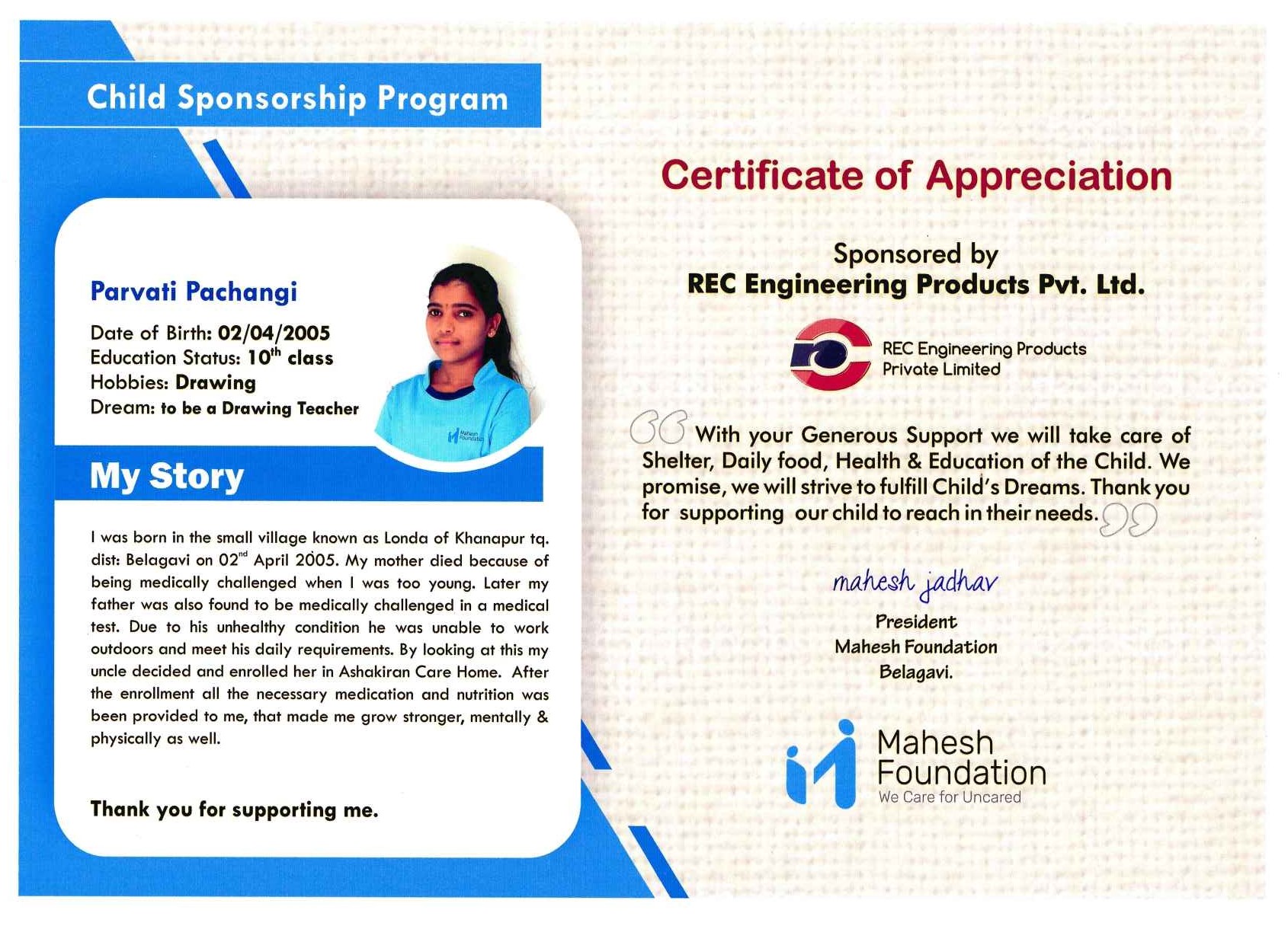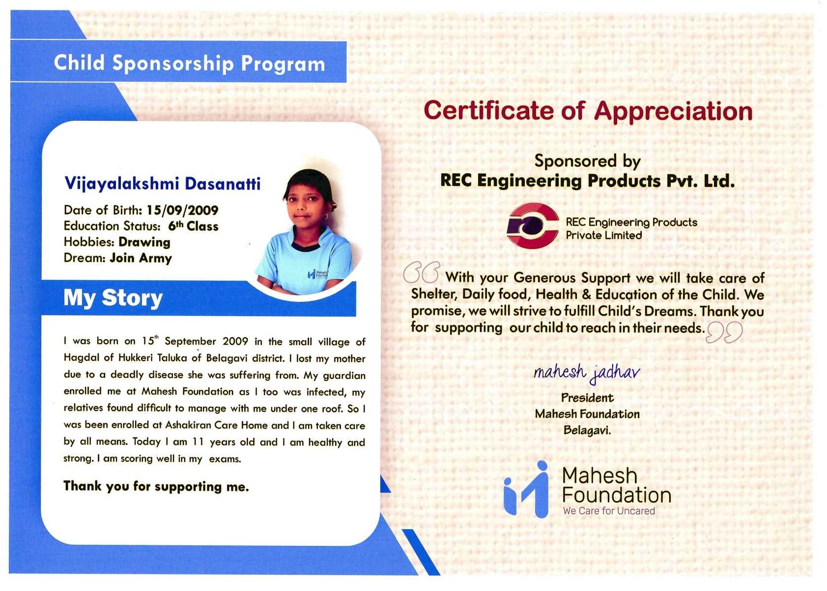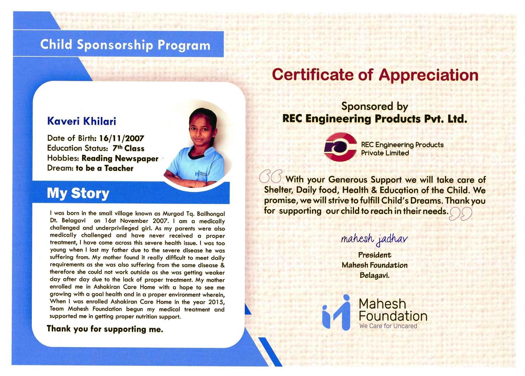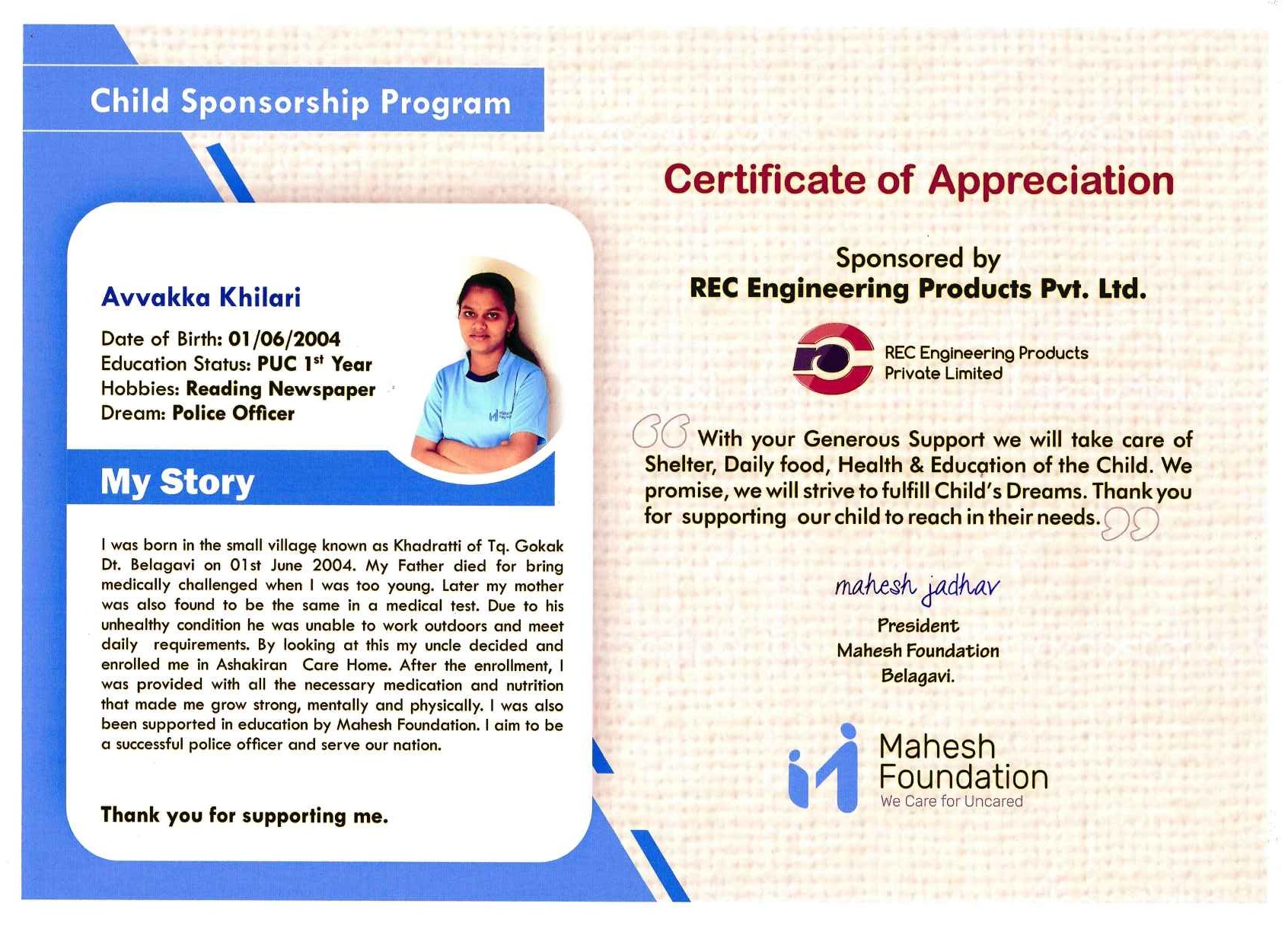 REC is providing generous support for the past 15 years to 10 underprivileged children at Mahesh Foundation to improve their quality of life.