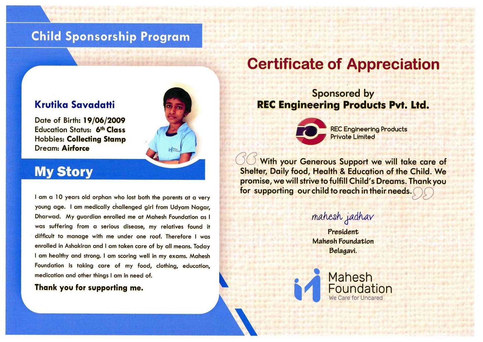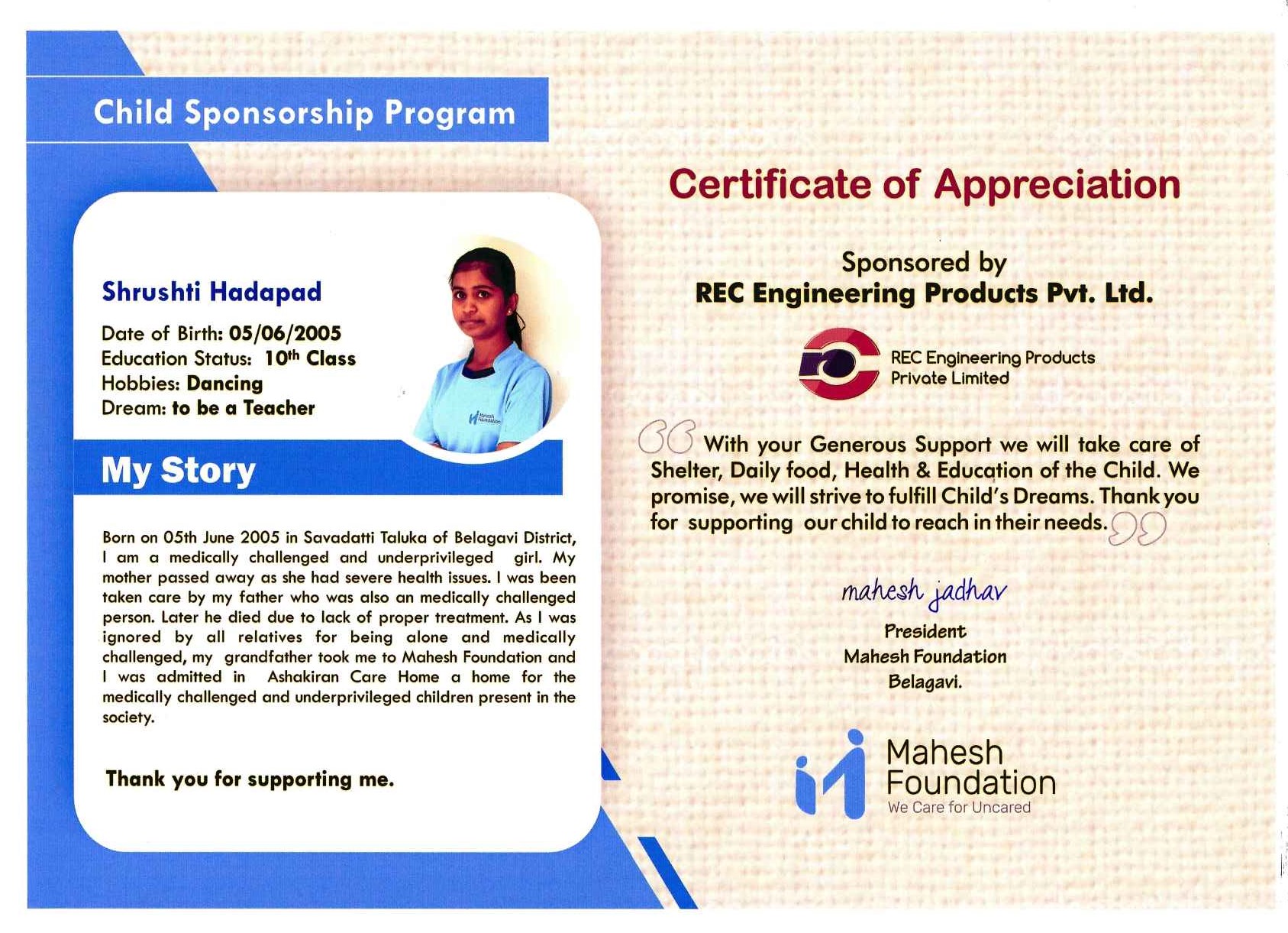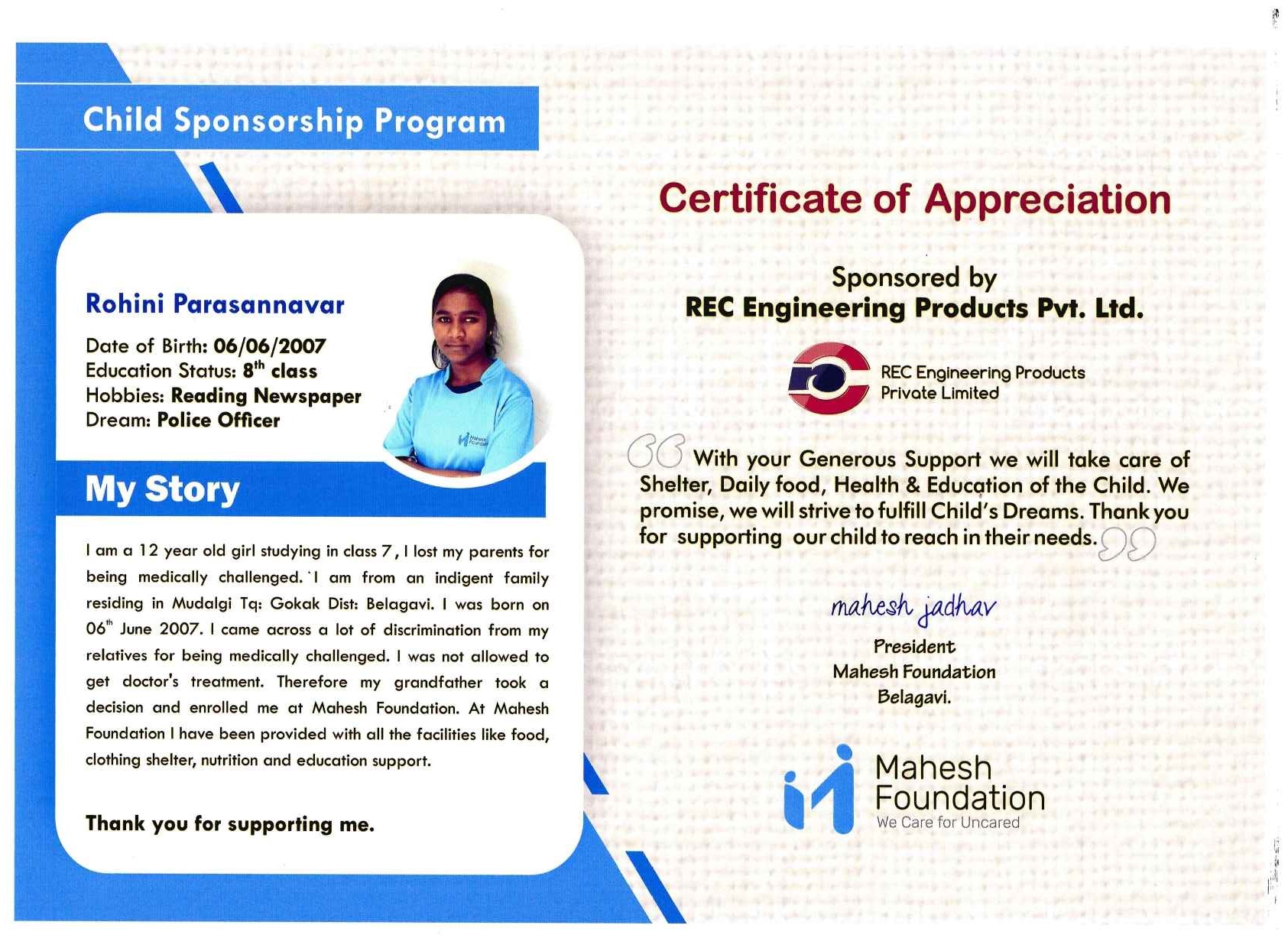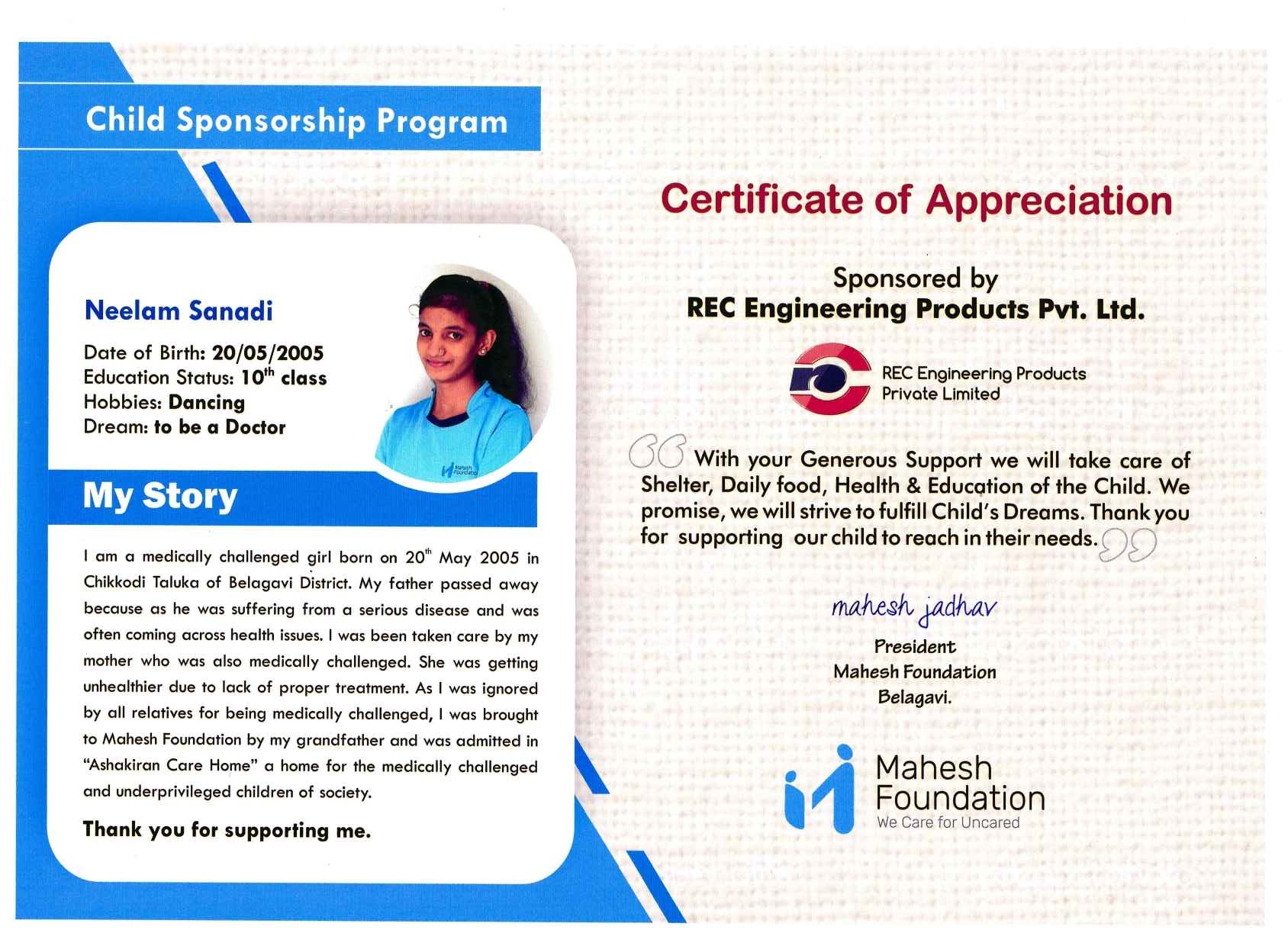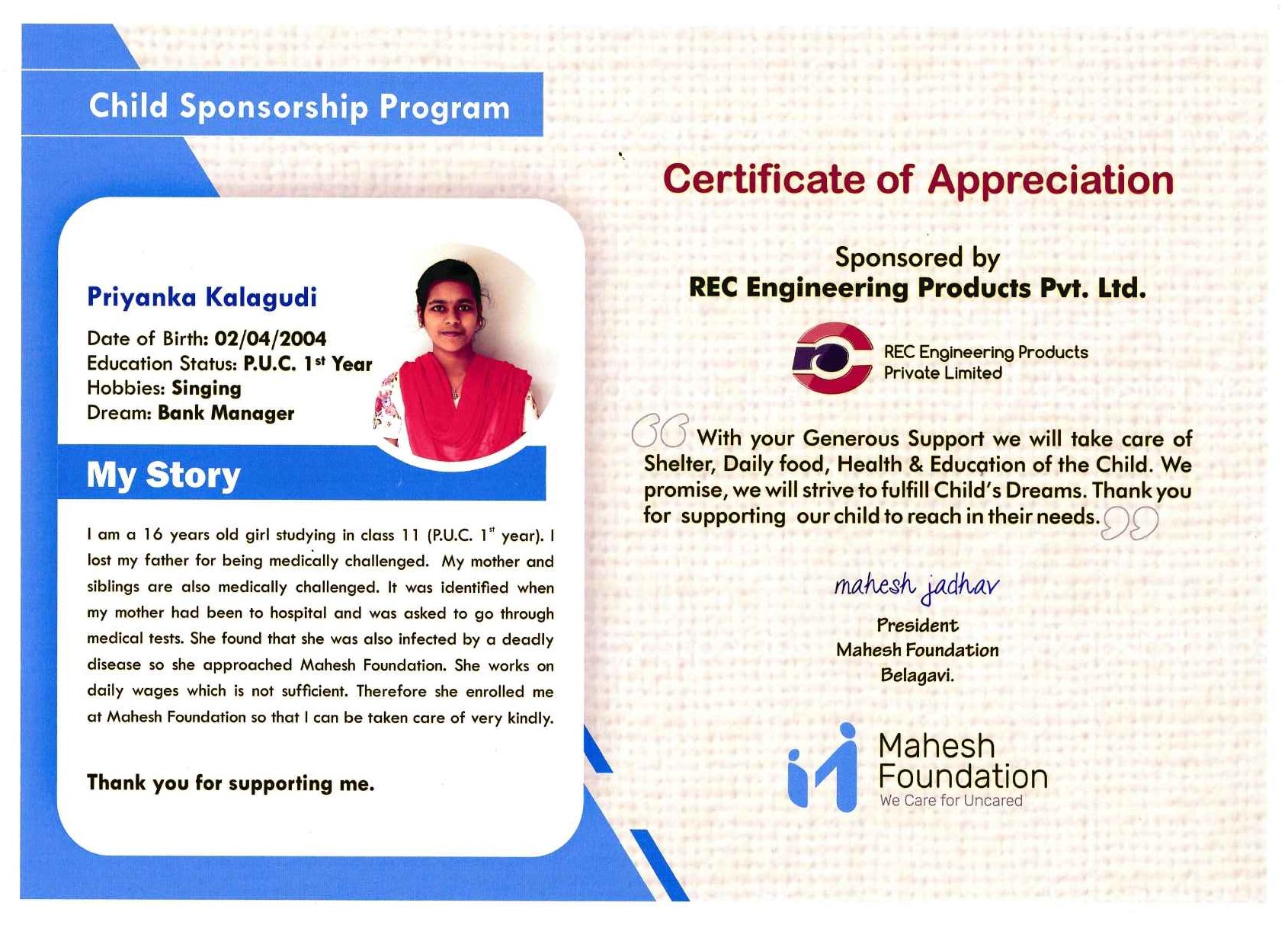 REC is providing generous support for the past 15 years to 10 underprivileged children at Mahesh Foundation to improve their quality of life.